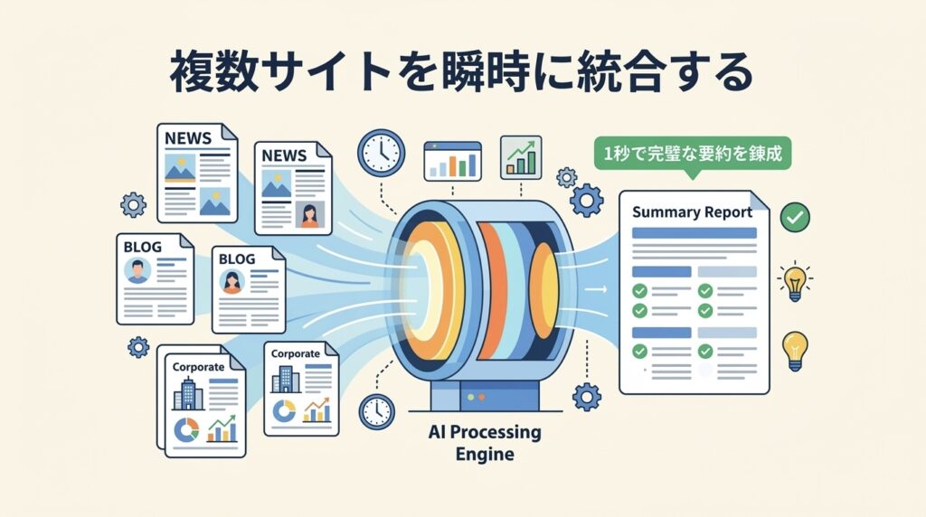 そして、それぞれのサイトから必要な情報だけをピンポイントで抽出し、事実関係を照らし合わせ、あなたが求めたフォーマット(箇条書きや表形式)で「一つの完璧な回答」として出力してくれます。