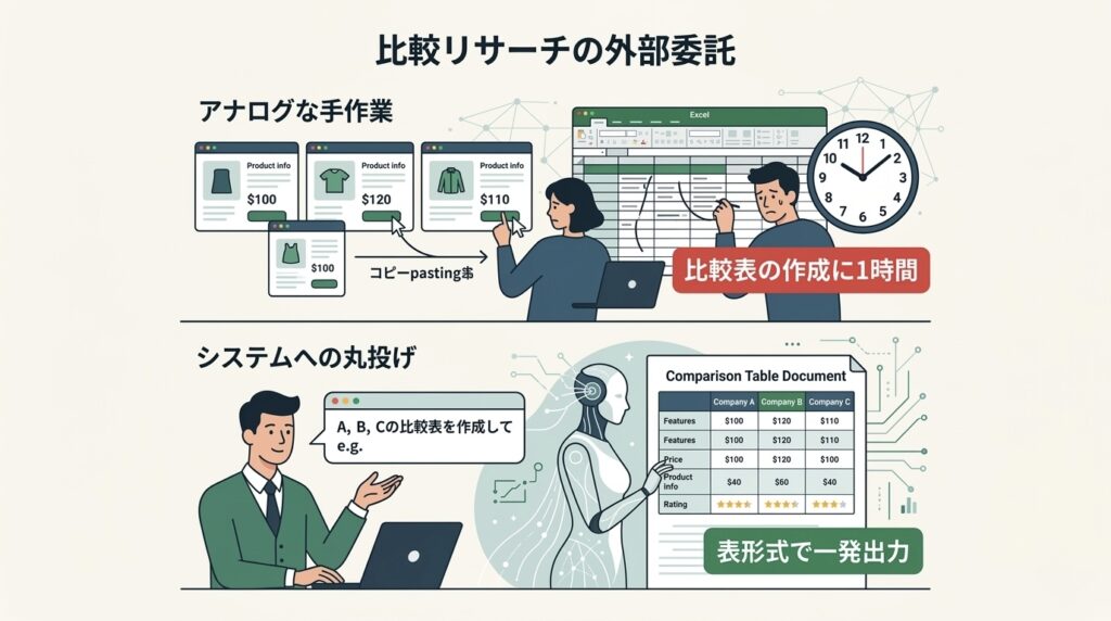 AI検索の真価が最も発揮されるのが、「複数の対象を比較するリサーチ」です。