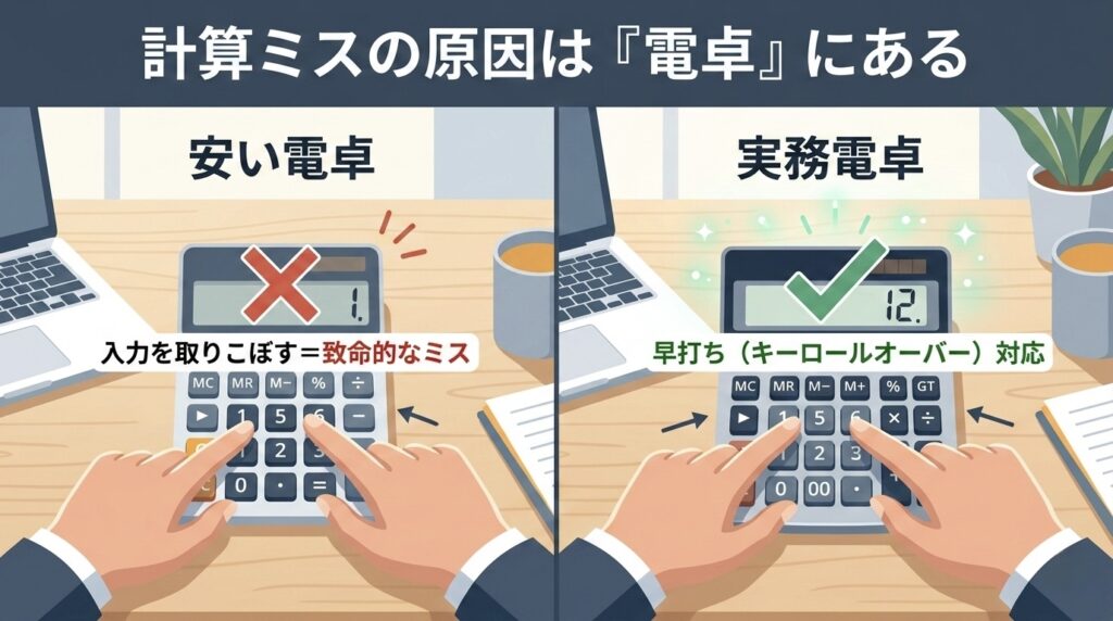 この理不尽な入力漏れを物理的に防ぐための絶対条件が、高級な実務電卓に必ず搭載されている「キーロールオーバー(早打ち機能)」です。