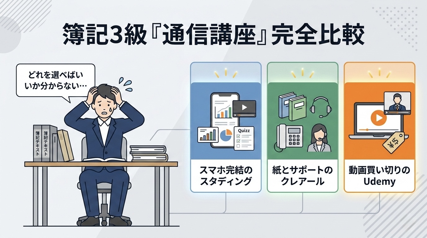 本屋でテキストを買うから挫折する。30代事務職が「簿記3級」をスマホで短期合格する通信講座・完全比較レビュー