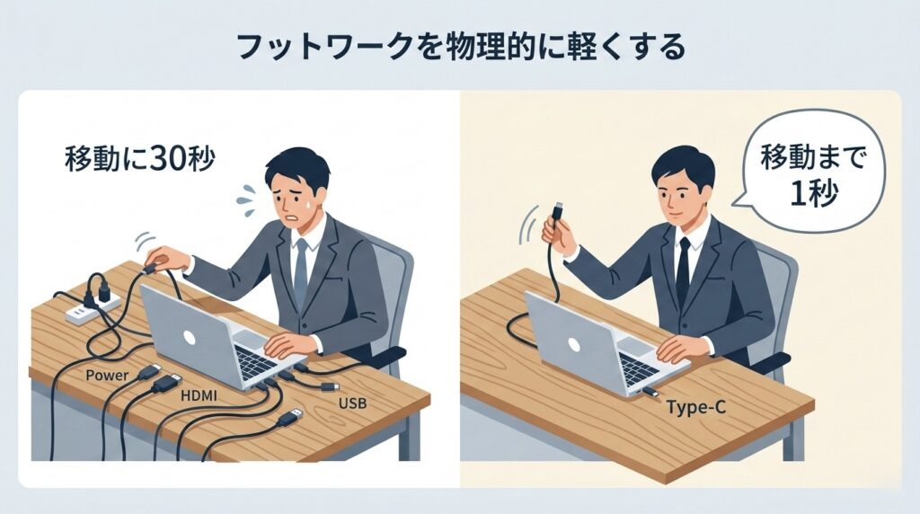 この「移動のたびに発生する接続の摩擦」が、あなたのフットワークを重くし、「もうこのまま13インチの狭い画面で作業を続けよう」という妥協を生み出しているのです。