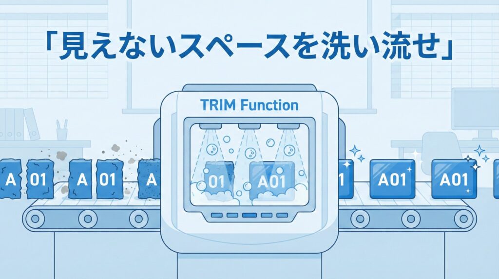 【解決策】TRIM関数 作業列を作って =TRIM(A2) と入力してください。 これで前後の余計なスペースを全て削除した「綺麗なデータ」を作れます。