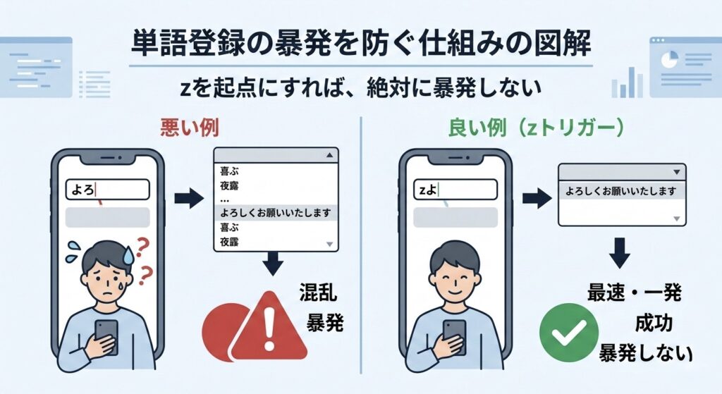 この暴発を完全に防ぐための最強のハックが、読みの先頭に「普段の日本語入力では絶対にあり得ない子音」をつけることです。