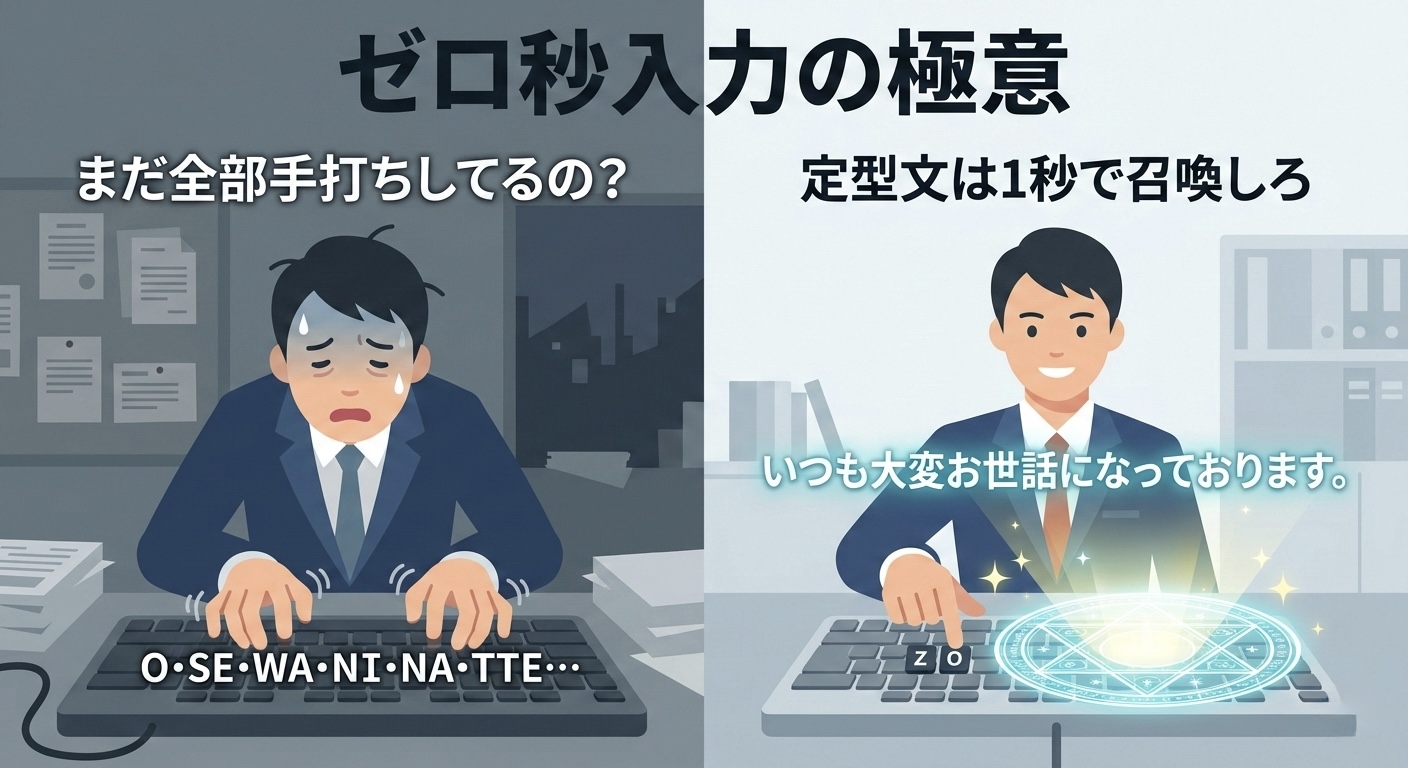 そして何より、1日に何十回も同じ「お世話になっております」をキーボードで打ち込む行為は、あなたの指の関節を消耗させ、脳のメモリを無駄に消費する極めて非効率な「肉体労働」です。