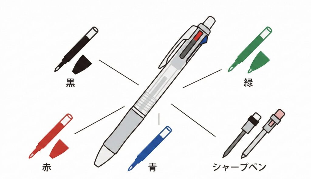 おすすめは「ジェットストリーム 4&1(フォーアンドワン)」です。 これ1本に「黒・赤・青・緑」の4色ボールペンと、「シャープペンシル」が入っています。