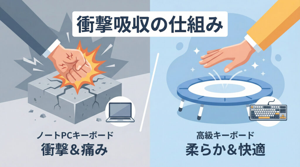 ノートPCのキーは薄いため、押した瞬間にすぐ底(基盤)に指が当たります。 これを「底打ち」と言います。 私たちは文字を打つたびに、指先で硬い板を叩いているようなものです。この微細な衝撃が、手首から肘、肩へと伝わり、慢性的な「取れない疲れ」になります。