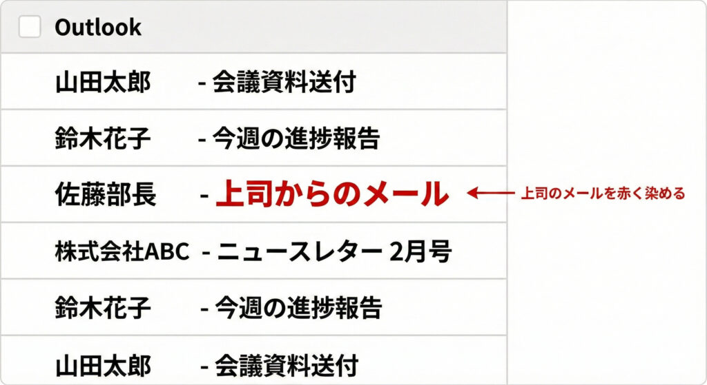 これを設定すると、受信トレイの中で部長のメールだけが「赤く太い文字」で表示されます。 どんなに忙しくても、これなら絶対に見逃しません。 視覚的に優先順位をつける、プロのテクニックです。