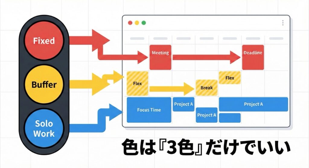 OutlookやGoogleカレンダーで、虹のようにカラフルに色分けしている人がいますが、時間の無駄です。 一瞬で脳が判断できる「3色運用」を推奨します。