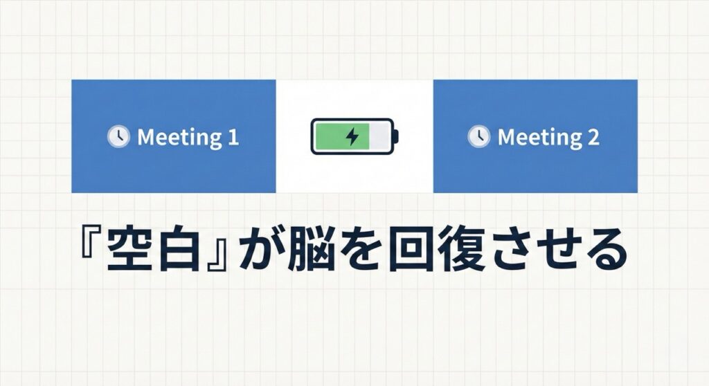 「13:00〜14:00 会議A」「14:00〜15:00 会議B」 このように隙間なく予定を入れるのは、物理法則を無視しています。 人間は瞬間移動できません。トイレにも行きます。