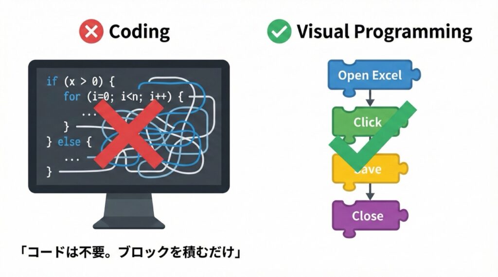 RPAと聞くと、黒い画面に英語のコードを打ち込む想像をするかもしれません。 しかしPADは、「日本語のブロックをドラッグ&ドロップするだけ」で作れます。
