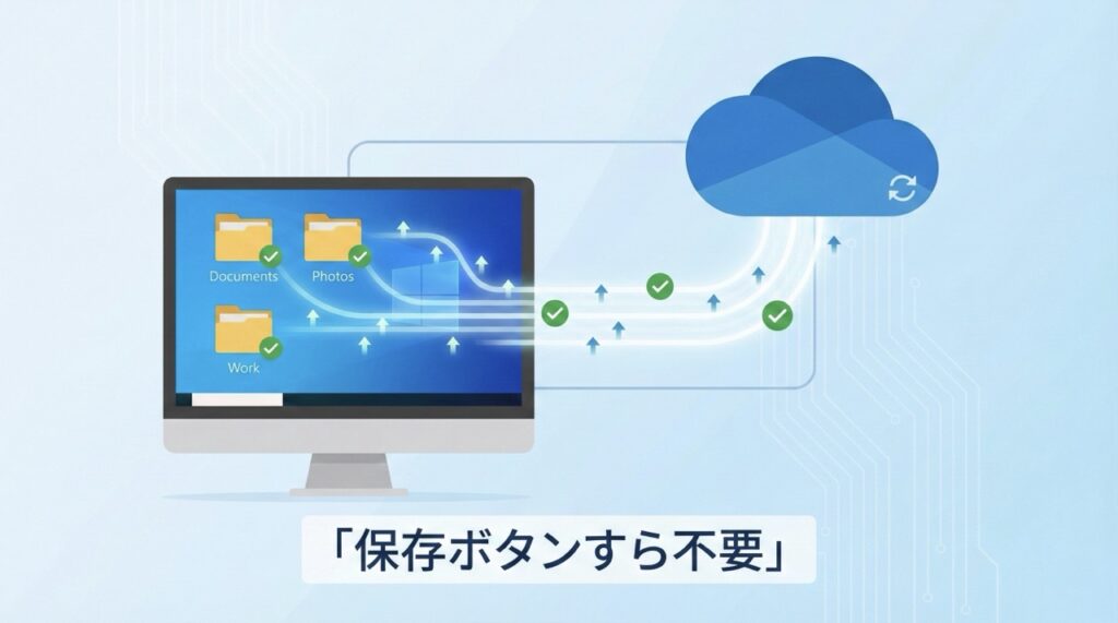 OneDriveの設定で「バックアップ」をオンにすると、「デスクトップ」「ドキュメント」「ピクチャ」の中身を丸ごとクラウドに同期してくれます。 これで、今まで通りデスクトップにファイルを置いても、裏側では勝手にクラウドに吸い上げられ、安全に守られます。