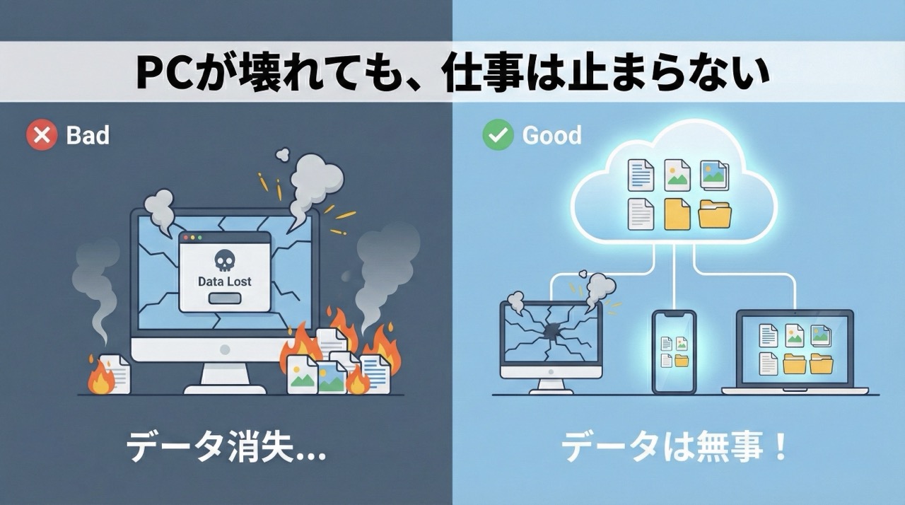 「PC本体」に価値を持たせてはいけません。 プロの事務職にとって、PCはただの「入力端末」です。 データ本体は、常に安全な「クラウド(空の上)」にあるべきなのです。