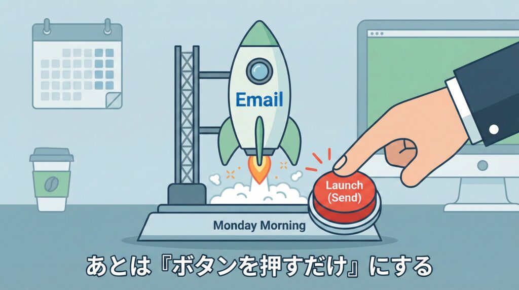 ここまで作って、PC(スマホ)を閉じます。 すると、月曜のあなたの仕事は「送信ボタンを押すだけ」になります。 「嫌な仕事の99%が終わっている」という事実は、最強の精神安定剤です。