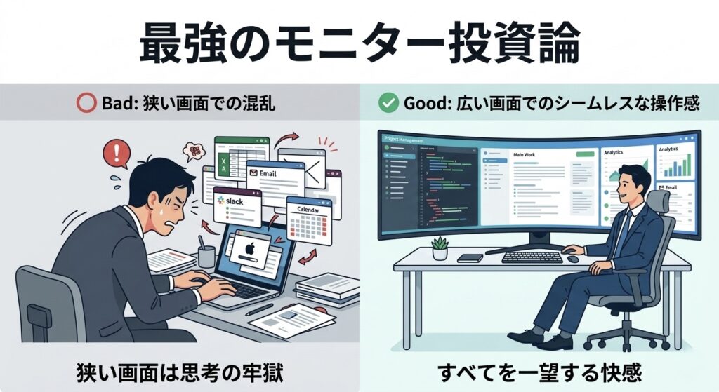 今回は、あなたの作業スペースを物理的に拡張し、ウィンドウ切り替えという無駄な動作を完全に消滅させる最強の自己投資、『ウルトラワイドモニター』の圧倒的な威力について徹底解説します。