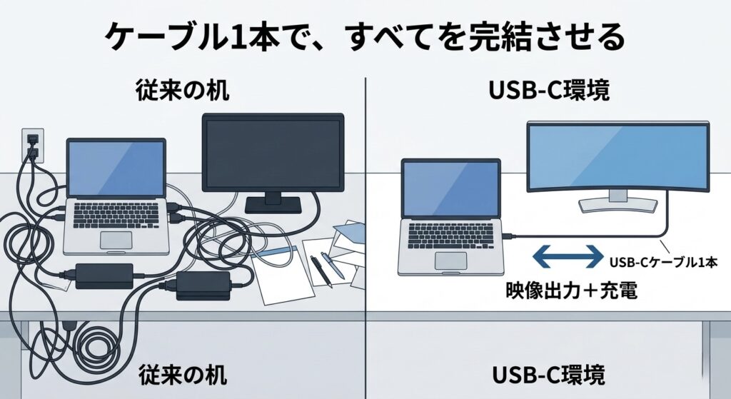 従来の環境では、ノートパソコンをモニターに繋ぐために「HDMIケーブル」を挿し、さらにパソコンの充電のために「巨大な電源アダプター」をコンセントに繋ぐ必要がありました。机の上が黒いケーブルでスパゲッティ状態になっている光景は、視覚的なノイズとして集中力を削ぎ落とします。