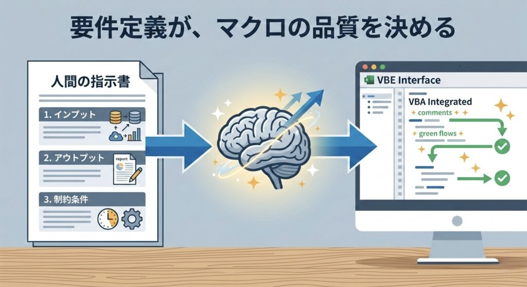 AIから完璧なマクロ(VBAコード)を引き出すためには、以下の3つの要素を箇条書きで明確に指示する必要があります。これを「要件定義」と呼びます。