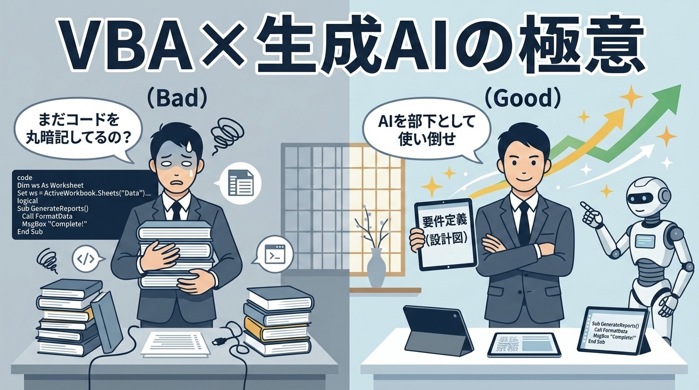 AIが出力したコードの固まりを見た時、変数(Dim)、繰り返し処理(For〜Next)、条件分岐(If)といった「プログラミングの基本構造」を知らなければ、あなたはAIが書いたコードが「何をしているのか」を1ミリも理解できません。