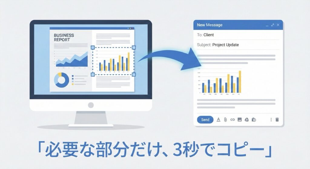 マウスで必要な部分をドラッグして囲むだけで、その範囲だけが綺麗にコピーされます。 あとは、TeamsやSlack、メール本文に直接 Ctrl+V で貼り付けるだけ。 「画像を保存する」という工程すら不要です。