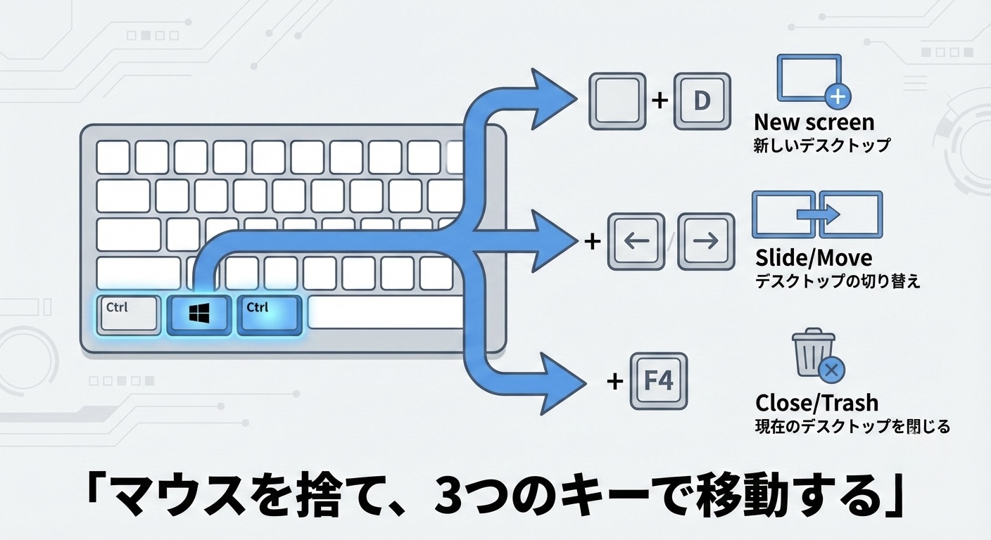 以下の3つのショートカットキーを、指の筋肉に記憶させてください。すべて「Windowsキー + Ctrlキー」の組み合わせです。