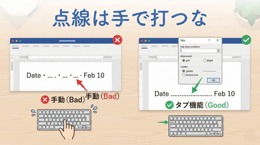 Tabキーを押すと、自動的に「日付………………2月10日」のように点線が引かれます。