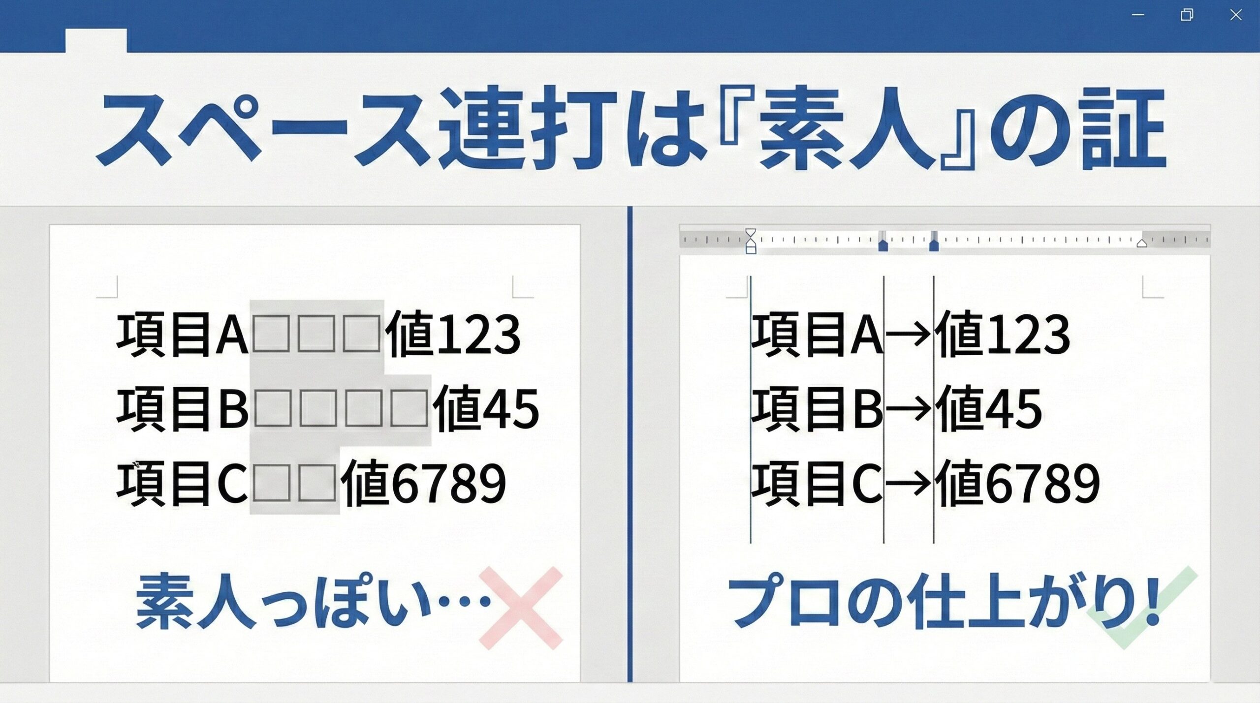 Wordにおいて、位置を揃える役割はスペースキーではありません。 「ルーラー(定規)」と「タブキー」です。
